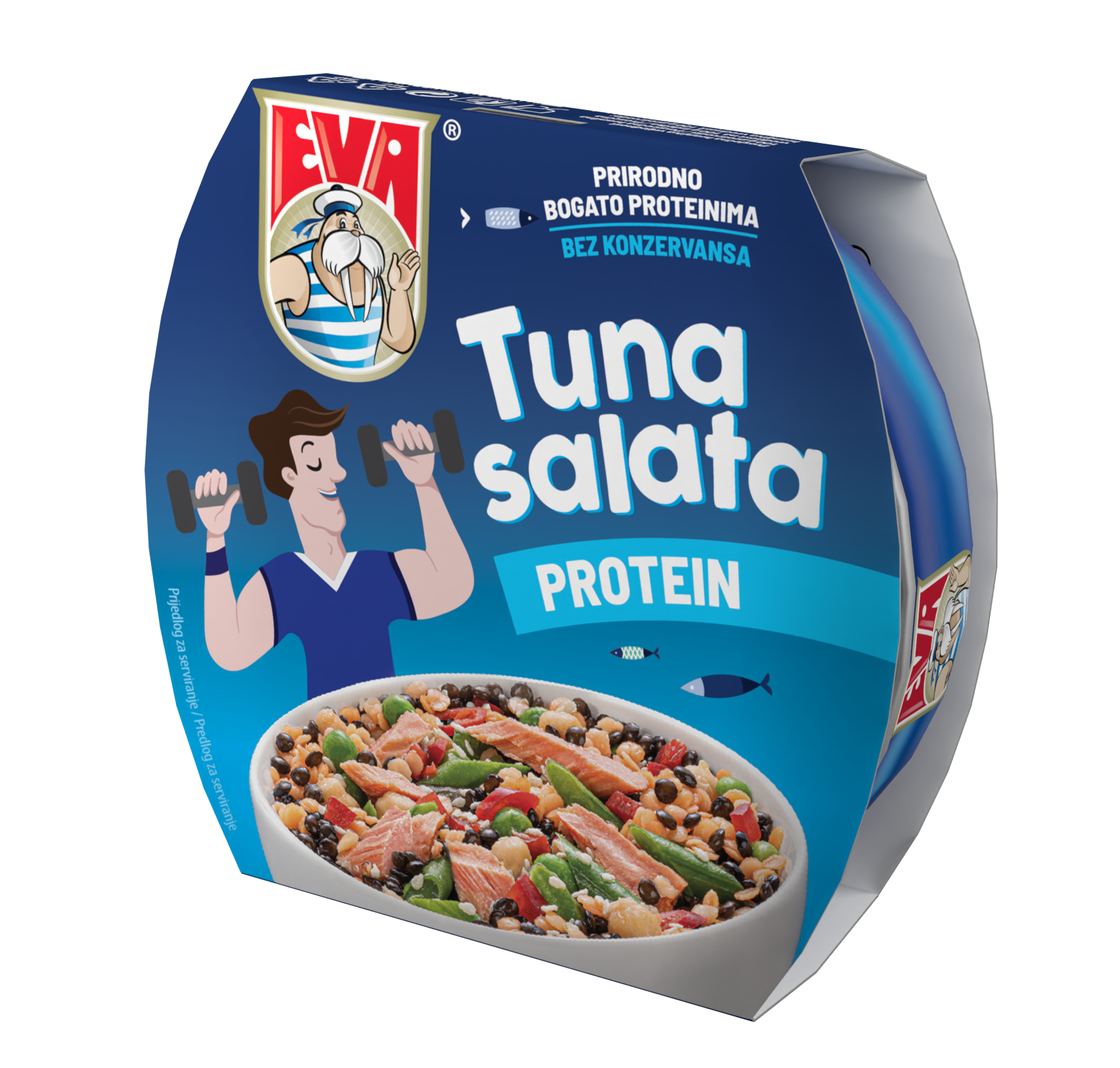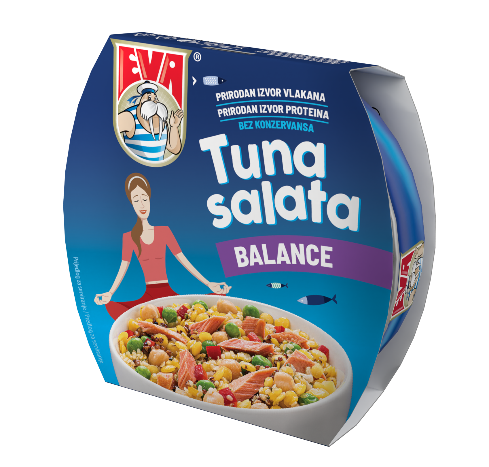 Već dobro poznati i omiljeni okusi Eva tuna salata Mexicane, Mediterane i Dalmatine, ističu se potpuno prirodnim sastojcima, a savršenstvo okusa i sastojaka čine pravu morsku priču kojoj je nemoguće odoljeti. Žitarične Eva tuna salate: crvena kvinoja, kus-kus i divlja riža, sadrže žitarice, ribu i povrće te su savršen i potpun obrok u svakoj prilici.